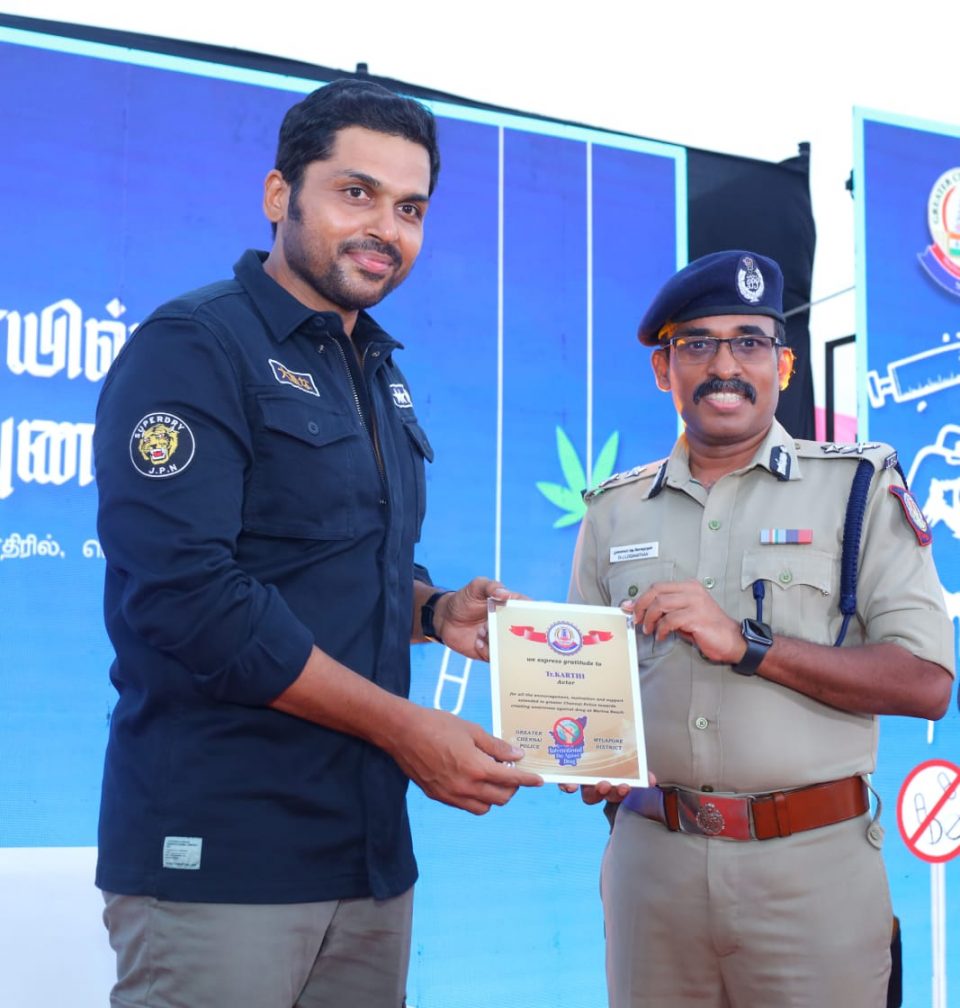 தமிழக காவல்துறையினர் சார்பில் சென்னை மெரினா கடற்கரையில் போதை பொருட்களுக்கு எதிரான விழிப்புணர்வு நிகழ்ச்சி நடைபெற்றது. இதில் சிறப்பு விருந்தின ராக கலந்துக் கொண்டார் நடிகர் கார்த்தி.