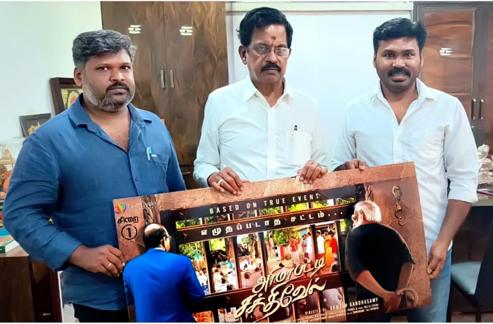 இயக்குநர்கள் கே எஸ் ரவிக்குமார், கரு பழனியப்பன், தயாரிப்பாளர் கலைப்புலி S. தாணு வெளியிட்ட, அரிமாபட்டி சக்திவேல் படத்தின் ஃபர்ஸ்ட் லுக் வெளியானது.