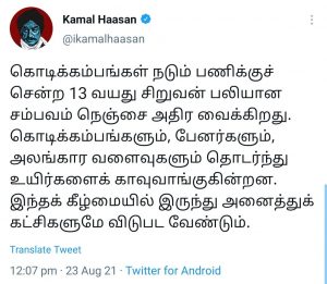 அரசியல் சினிமா செய்திகள் தமிழ் செய்திகள்பேனர், அலங்கார வளைவு: ம நீ ம தலைவர் கமல்ஹாசன் கண்டிப்பு by Jai ChandranAugust 23, 2021346 Total1 மக்கள் நீதி மய்யம் தலைவர் கமல்ஹாசன் வெளியிட்டுள்ள டிவிட்டர் மெசேஜில் கூறியதாவது: Total1