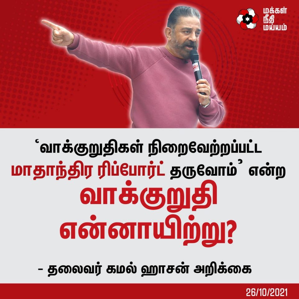 மாதாந்திர ரிப்போர்ட் கார்டு’ வழங்குவதை உறுதிசெய்யுங்கள் என மக்கள் நீதி மய்யம் தலைவர் கமல்ஹாசன் கூறியுள்ளார்.
