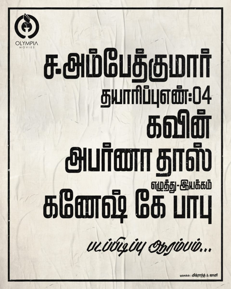 ஒலிம்பியா மூவிஸ் (Olympia Movies) சார்பில் தயாரிப்பாளர் எஸ்.அம்பேத் குமார் எப்போதுமே சிறந்த கதைகள் கொண்ட உணர்வுபூர்வமான திரைப்படங் களை தந்து வருகிறார். அந்த வகையில் அவரது தயாரிப்பில் புதிதாக உருவாகும் “Production No.4” திரைப்படத்தில் கவின் மற்றும் அபர்ணா தாஸ் ஆகியோர் முக்கிய வேடங்களில் நடிக்கின்றனர். இப்படத்தை ‘கடாரம் கொண்டான்’ படத்தின் இயக்குனர் ராஜேஷ் எம். செல்வாவின் முன்னாள் உதவியாளர் கணேஷ் கே. பாபு இயக்குகிறார். இத்திரைப்படம் நவீனகால பின்னணியில், கேளிக்கை மற்றும் பொழுதுபோக்கு அம்சங்களுடன் கூடிய உணர்ச்சிகரமான காதல் கதையாக உருவாகிறது.