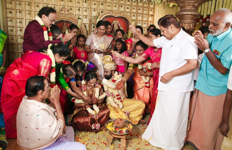 The wedding ceremony of G. Dhananjayan’s elder daughter Revati with Abhishek was held on November 20, 2022 at PSB Conventions Hall, Ambattur, Chennai. The event spangled with the presence of leading icons and celebrities of Tamil film industry. Renowned actor-orator Thiru Sivakumar took part along with his family and handed the marriage thread (thaali) to Abhishek to tie the knot on Revati.
