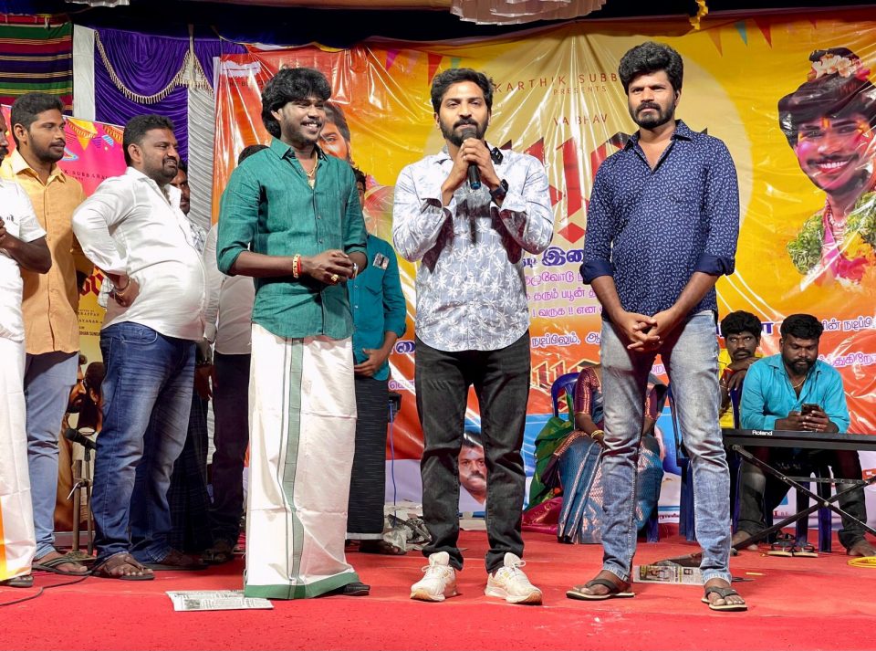 Team Buffoon visited Perambalur yesterday as part of their release promotions. The movie is hitting screens across Tamilnadu on September 23. Athankudi Ilayaraja who plays a prominent role in the movie Buffoon is a popular singer and folk artist across Tamilnadu. Actor Vaibhav and Director Ashok Veerapan visited Ilayaraja’s performance spot and entertainment the audience with their impromptu dance. Ilayaraja and his team will be travelling to various places in Tamilnadu for performing in temples. And Team Buffoon will visit and take part in the celebrations. The production house of the movie Stonebench has charted out an extensive plan for these cross promotions. The movie promises to be an action drama and is an important movie in Actor Vaibhav’s career. The movie hits the screen on September 23.