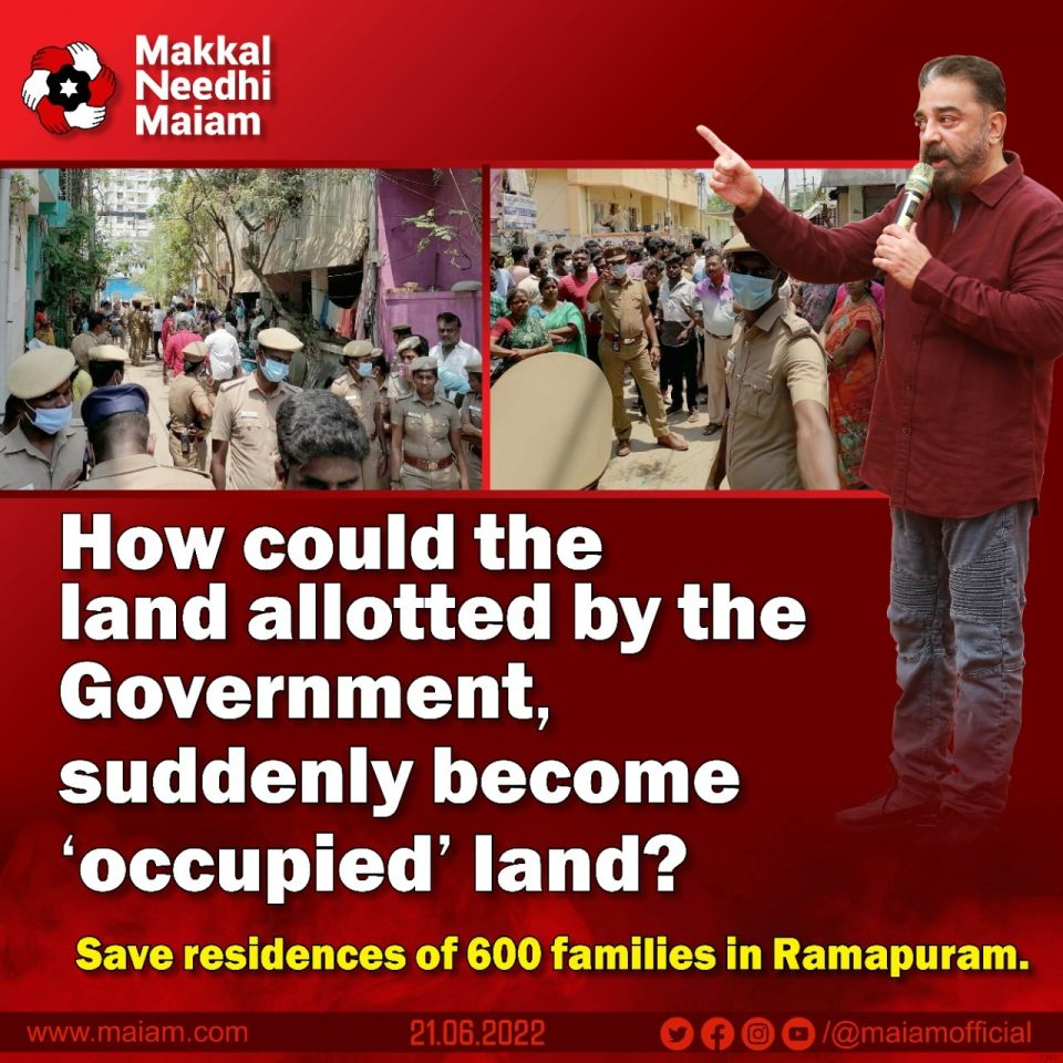 When the government departments submit the documents in the court, it will be clear to all that these were indeed allotted by the government. Until then, Makkal Needhi Maiam requests the Corporation and the police not to take any undue action or threaten the residents of Thirumalai Nagar.