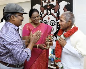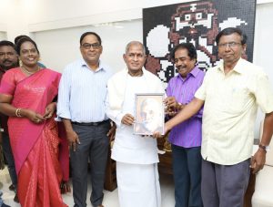 இளையராஜாவுக்கு அன்பு பரிசாக முருகன் சிலையும், ரமணர் ஓவியமும், அவர் பெயரில் அர்ச்சனை செய்த வடபழநி கோயில் பிரசாதமும் வழங்கப்பட்டது.