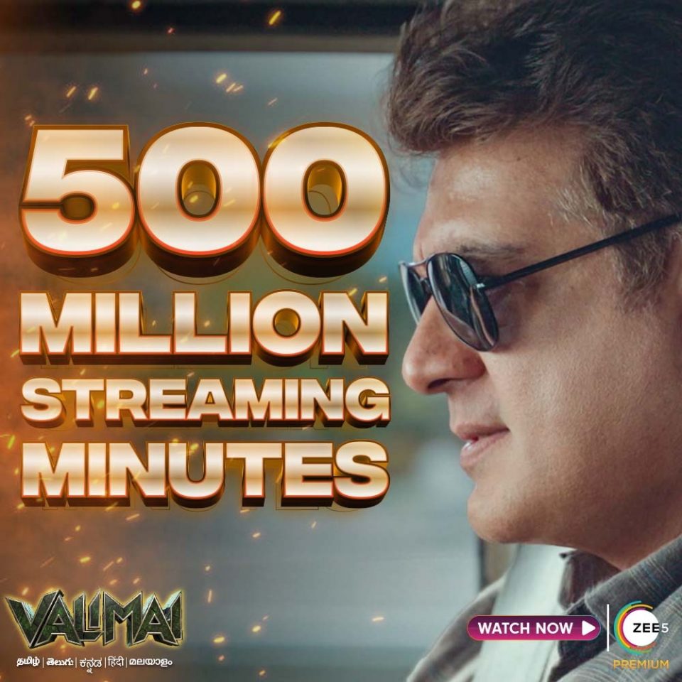 ஜீ 5 ஓடிடி தளத்தில், நடிகர் அஜீத் குமாரின் சூப்பர்ஹிட் பிளாக்பஸ்டர் திரைப்படம் “வலிமை” 500 மில்லியன் ஸ்ட்ரீமிங் பார்வை நிமிடங்களை கடந்து, சாதனை படைத்துள்ளது.